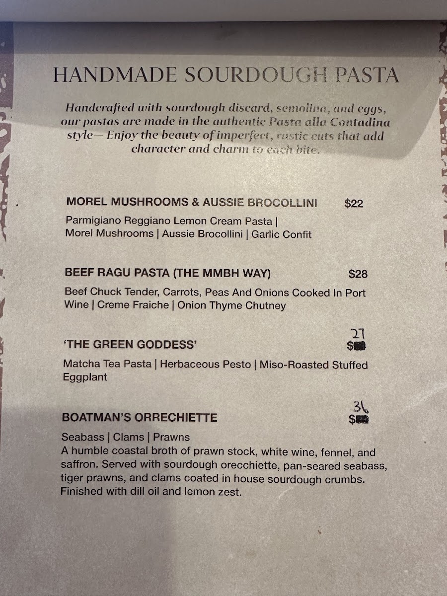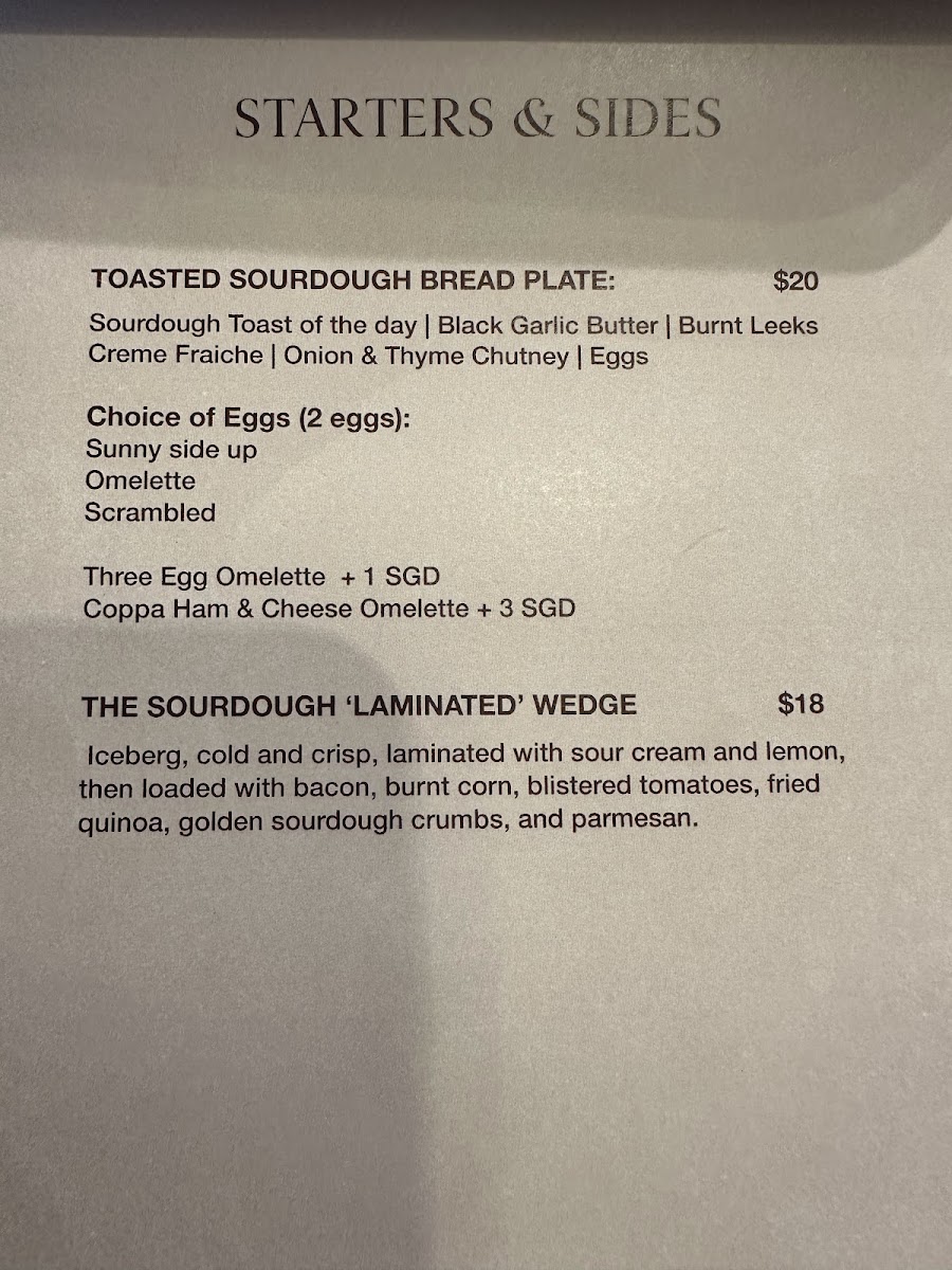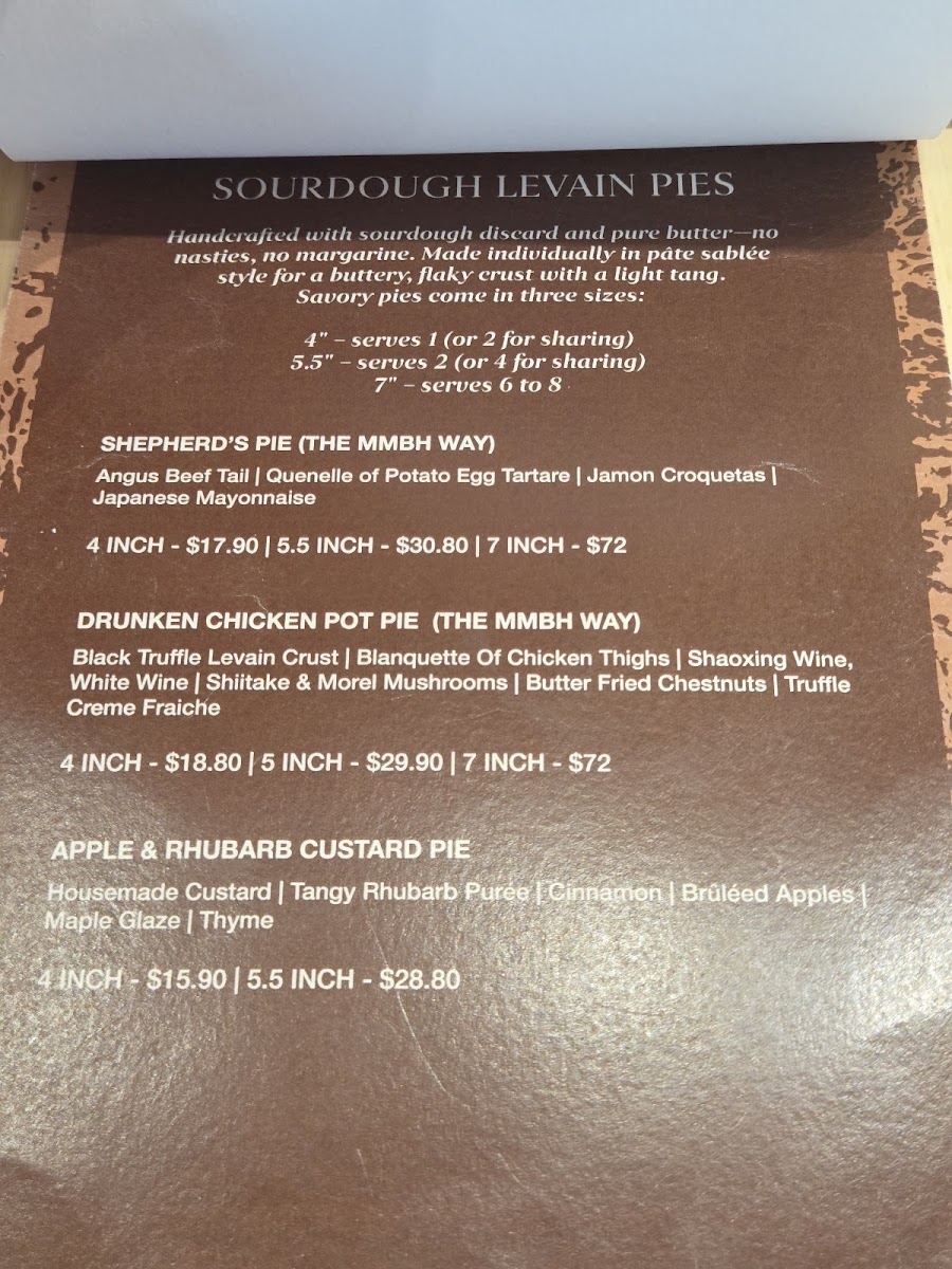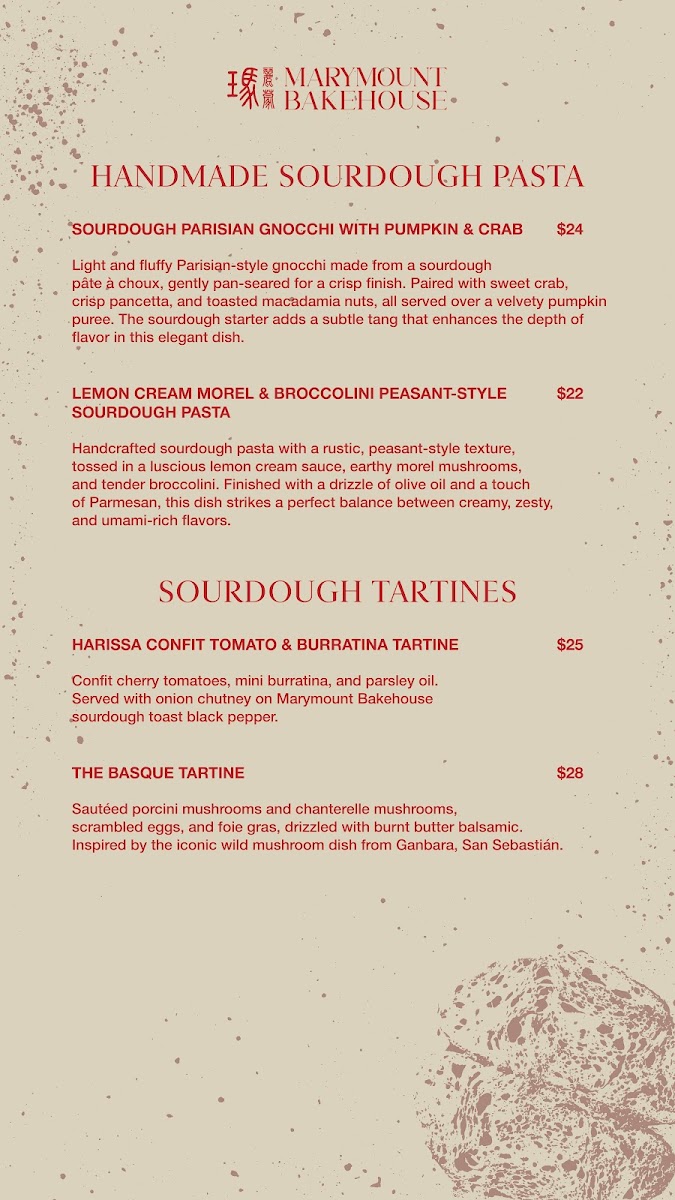 Marymount Bakehouse Singapore offers a menu centered around café and bakery fare with a strong emphasis on sourdough-based dishes. The selection includes a variety of baked goods, savory pies, and pasta made using sourdough techniques, reflecting a blend of bakery and casual dining options.